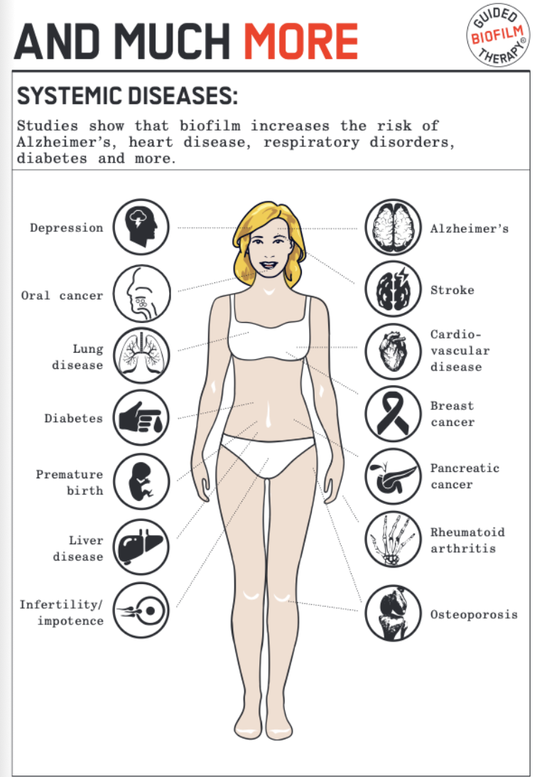 Biofilm je hlavní příčina vzniku zubních kazů, parodontálních onemocnění a infekcí kolem implantátů. Zobrazení biofilmu se provádí pomocí speciálního chemického zdravotně nezávadného roztoku, který při styku s bakteriemi vytvoří chemickou reakci a barevně zobrazí postižená místa na měkkých a tvrdých tkání. Barevné rozlišení umožňuje odlišit stáří, vyzrání plaku.