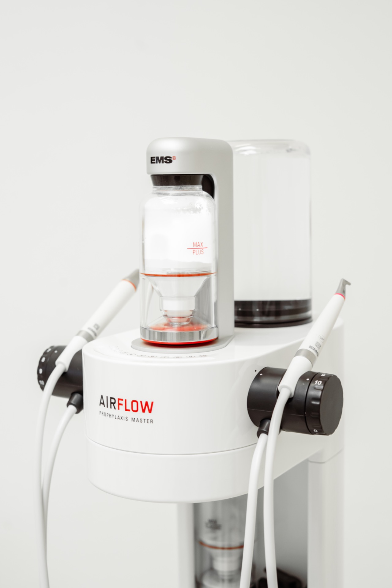 Po detekci plaku následuje odstranění biofilmu a skvrn z tvrdých a měkkých tkání, a to pod dásní i nad dásní pomocí AIR FLOW s velmi jemným práškem. Díky tomuto postupu je po AIR FLOW snadno viditelný zubní kámen. Rovněž dochází k odstranění biofilmu z dásní, jazyka a patra.